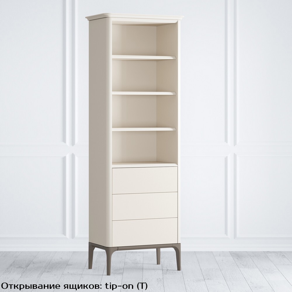 Верхняя часть окрашена в цвет светлый беж (K07 - ближайший RAL 9001), низ в коричневый цвет (K09 - ncs 4005 y50r). Имеется опция способа открывания ящиков: с помощью ручки (направляющие с доведением) или нажатием на фасад (tip-on).