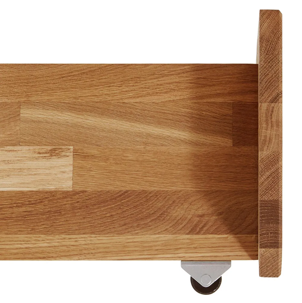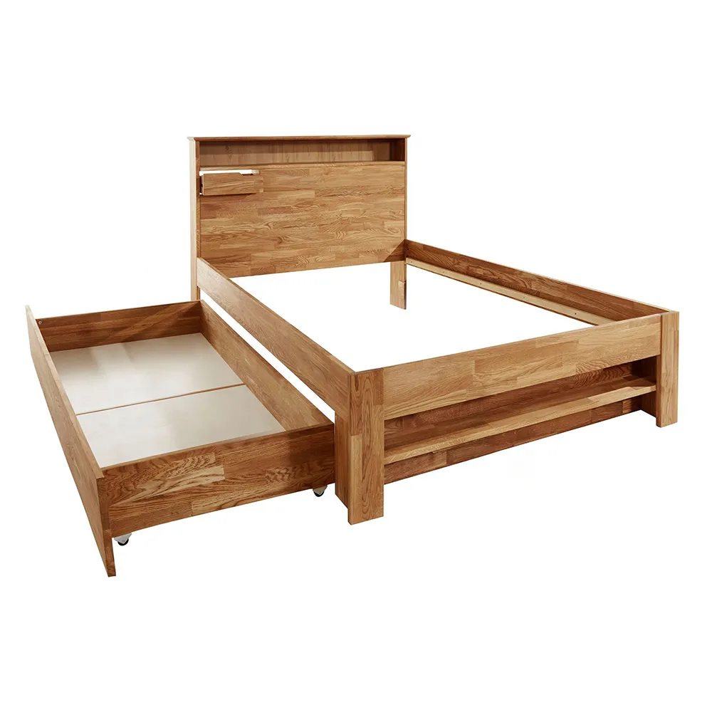 В изголовье и в изножье кровати есть широкие встроенные полки, в изголовье также сделаны маленькие выдвижные ящики для мелочей с каждой стороны. Кроме этого, кровать комплектуется двумя выкатными ящиками для хранения одежды и постельного белья.