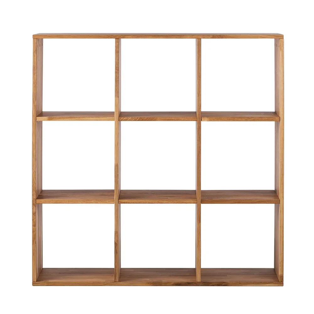 Стеллаж изготавливается из натурального долговечного материала – массива дуба. Дерево имеет красивую текстуру и приятно на ощупь. У стеллажа девять открытых полок. Он поставляется в разобранном виде, в двух упаковках. Размеры стеллажа 1130х350х1130 мм, вес 48 кг. Гарантия на изделие – 1 год.