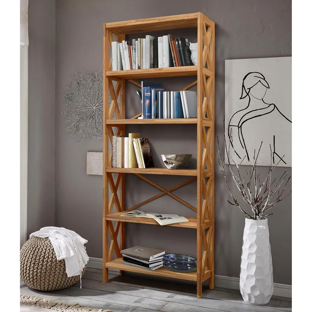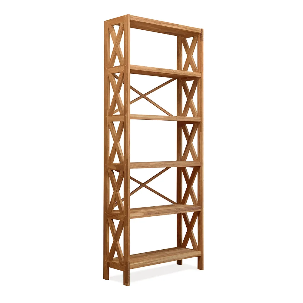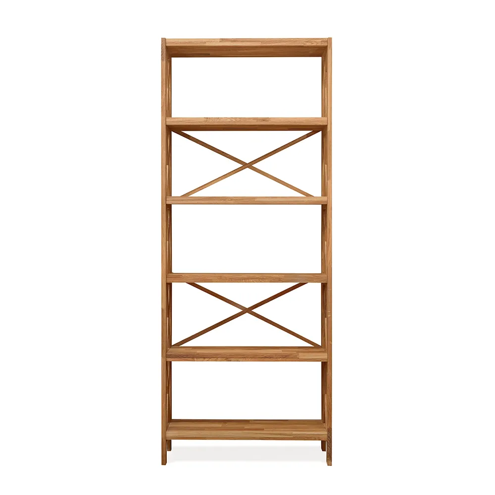 Сквозной стеллаж изготавливается из натурального долговечного материала – массива дуба. Дерево имеет красивую текстуру и приятно на ощупь. У стеллажа пять открытых полок. Он поставляется в разобранном виде, в одной упаковке. Размеры стеллажа 790х300х1980 мм, вес 32 кг. Гарантия на изделие – 1 год.